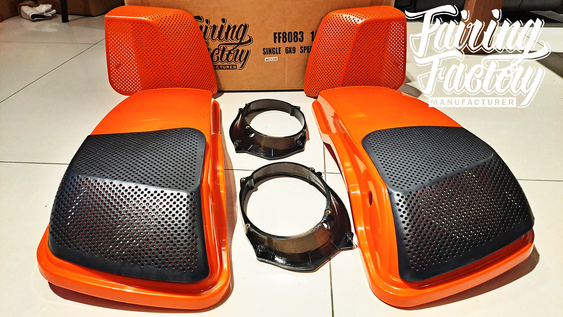 -pair speaker lids /w large grills, injection molded. orange color (The purpose is to distinguish cheap-recycle plastic lids from China)